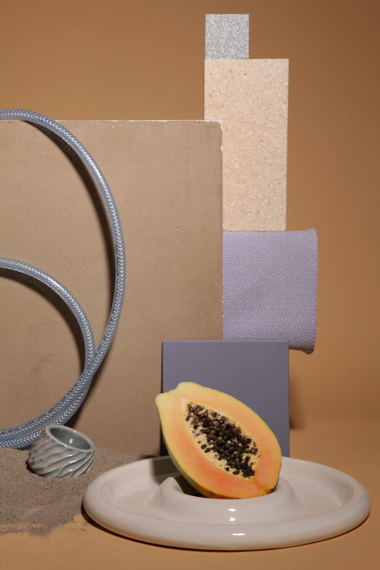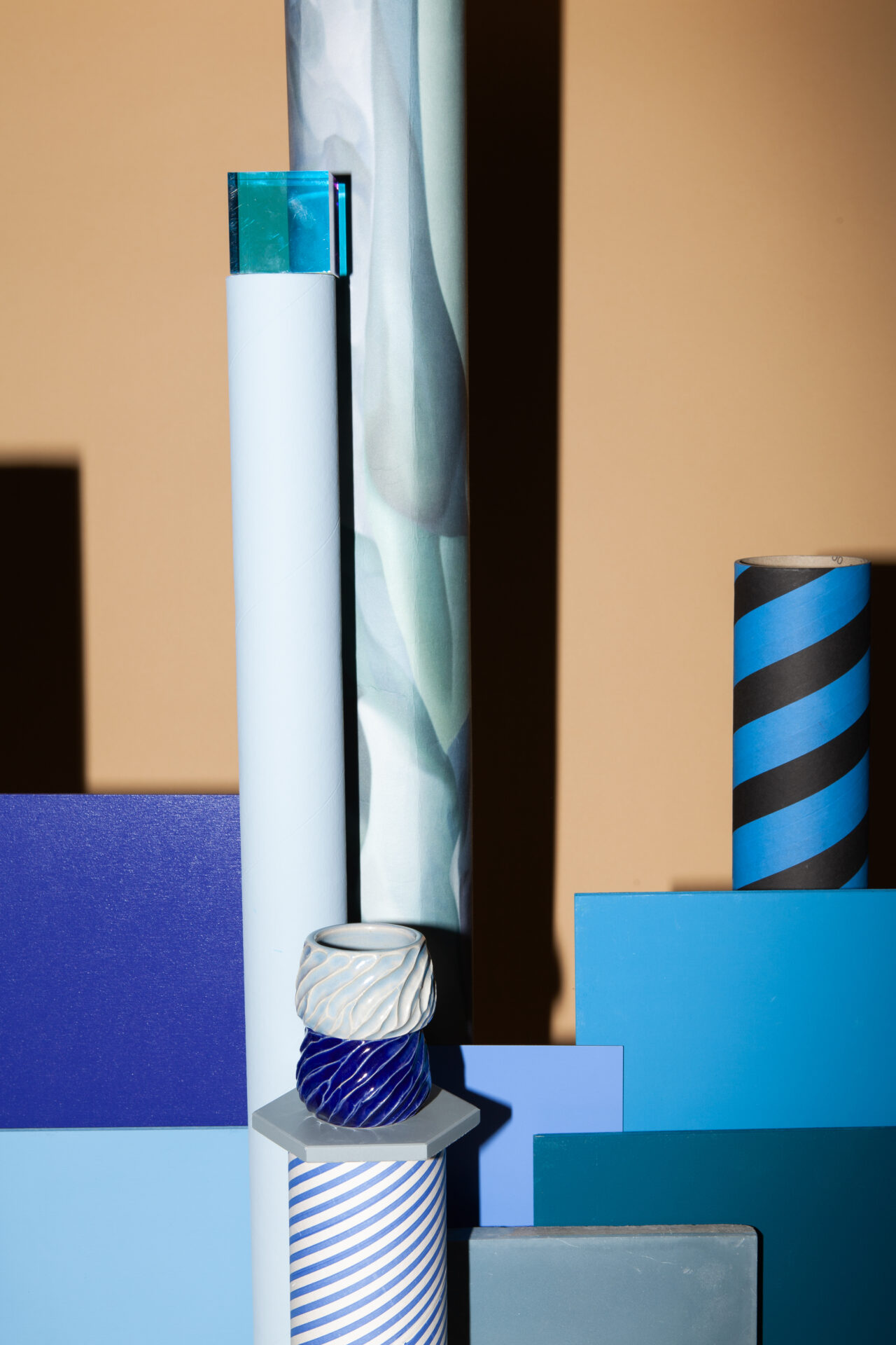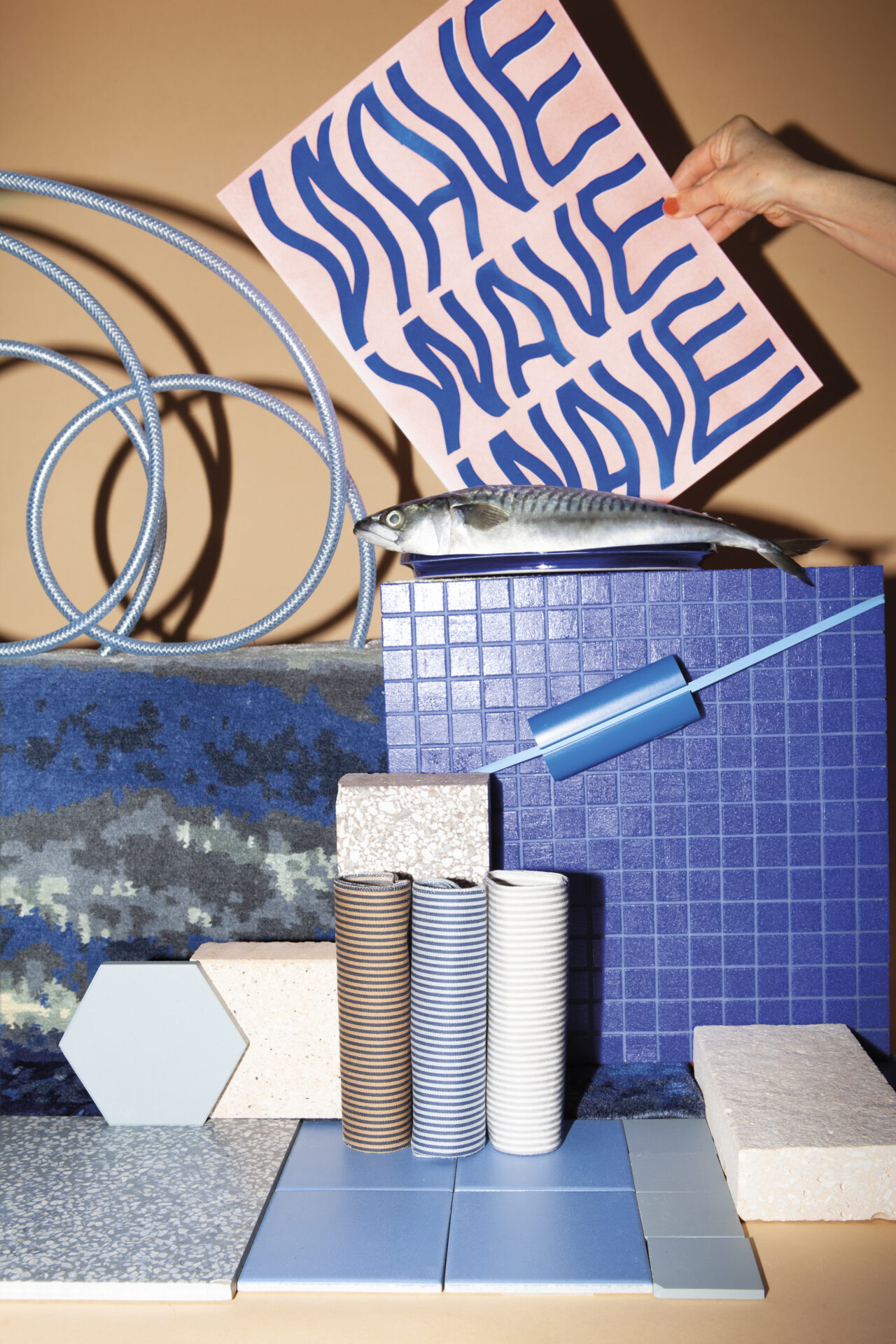 Blauserie für die Juliausgabe 2024 der Wohnrevue. Moodboard aus dem Material- und Farbfundus von Maria Degiorgi, Irène Münger und Kathrin Wiedmer aka MIK Studio.